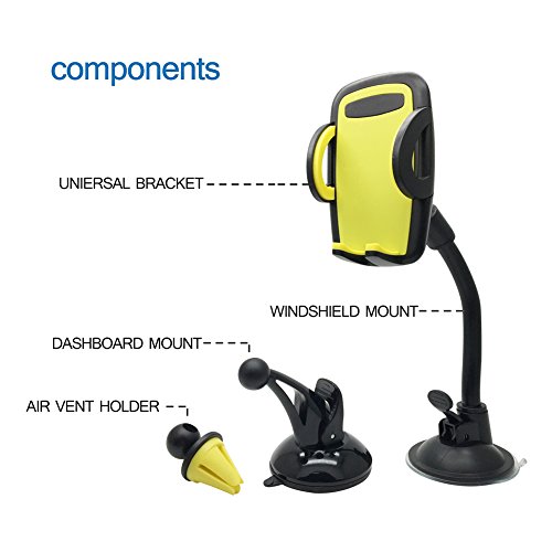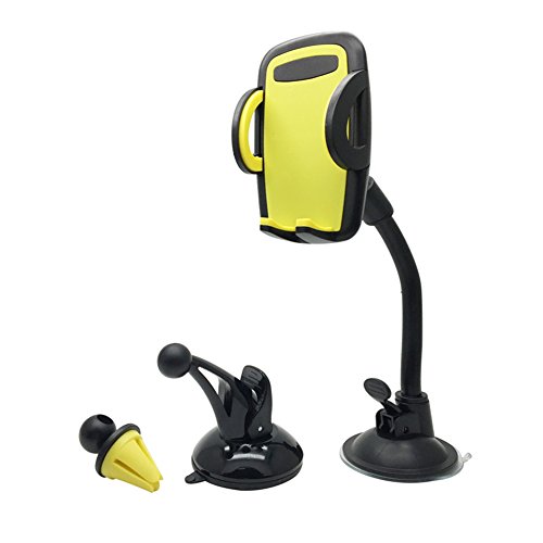 Car Mount Holder, 3-in-1 Cell Phone Holder, Air Vent Cell Phone Holder, Dashboard Mount Windshield Car Mount for iPhone 7, 6, 6S, Samsung and More (Yellow)
