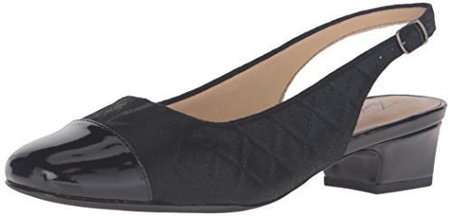 -. Feature : Cap-toe slingback pump with low block heel / Cushioned instep