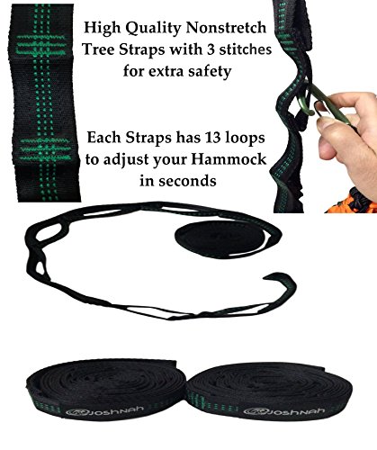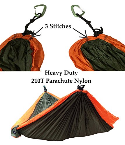 ✅ MADE TO LAST - This JoshNAh Double Hammock is made with strong attention to detail. Every part is high quality. The Hammock is 210T parachute nylon. Both Tree Straps and Hammocks have 3 stiches and Carabiners are Aluminum. The hammock is big and all parts are sturdy enough to fit 2 or 3 people up to 500 pounds.