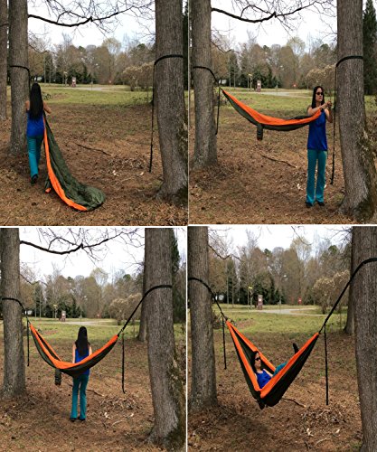 ✅ QUICK AND EASY SETUP - This complete set is an easy set up, and will make you relax in just few minutes. Because the 9 feet tree straps are adjustable with 13 loops, you can easily adjust the height of your double hammock without moving them by clipping the aluminum carabiners into the strap loops!