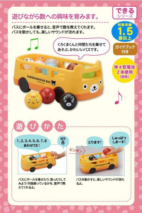 | くろくまくんと仲間たちを乗せてあそぶ、かわいいバスです。ボールを乗せたり取ったりする遊びのなかで、1から10までの数にくり返しふれ、数への興味を育みます。 |