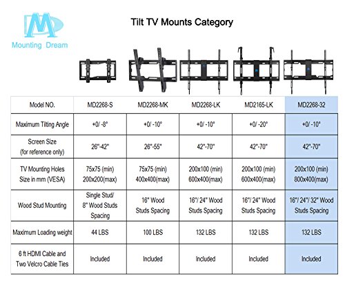 -. Title : Mounting Dream MD2268-32 TV Wall Mount Bracket for most of 42-70 Inch LED, LCD, OLED and Plasma Flat Screen TV with 10 Degree Tilting, up to VESA 800x400mm and 132 lbs