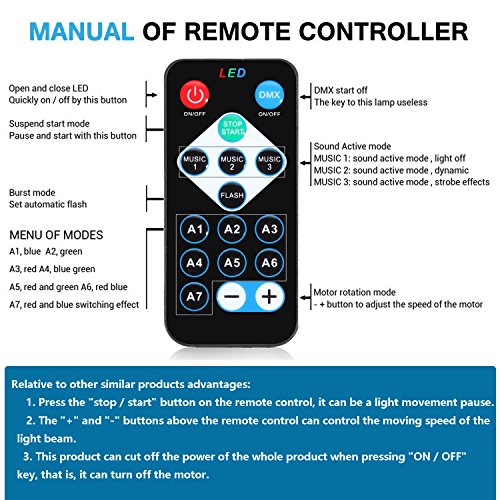 【7 Color Lighting & 3 Mode With Remote】7 COLORS Disco Lights Mode:A variety of color mode selection, composed of red green and blue(red, green, blue,red/green,red/blue,green/blue,or all the colors together).Music mode:according the rhythm of sound changes color;Auto mode: auto switch colors;Flash mode:comes with strobe program,also can adjustable strobe speed.