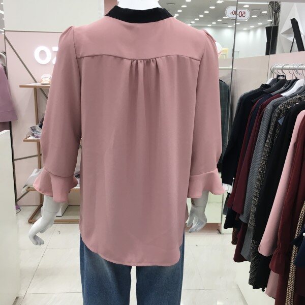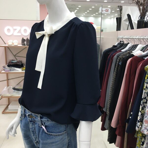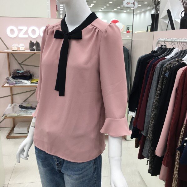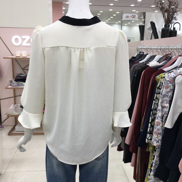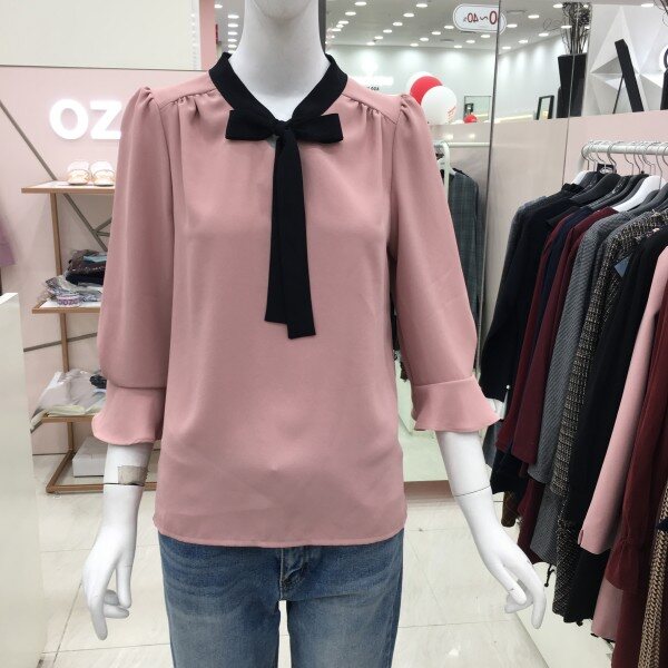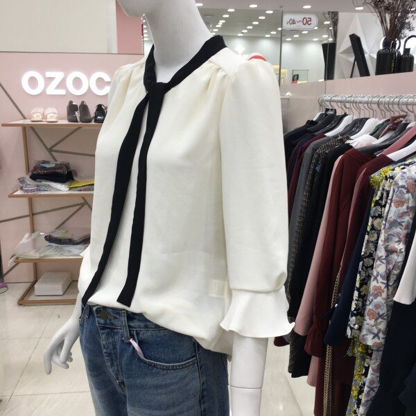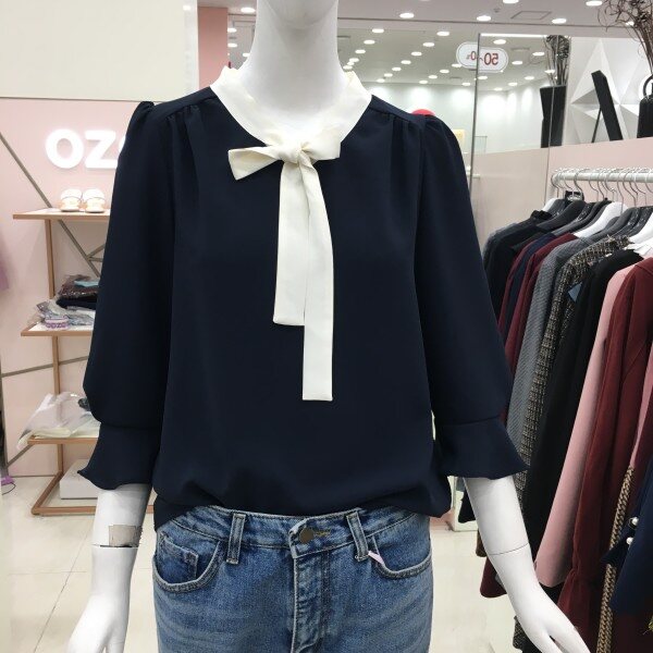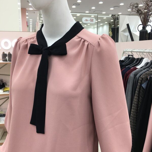 배색 리본 디테일이 포인트로 있는 블라우스 소개하드려요. 포멀하면서도 페미닌한 무드가 있어 단품 혹은 자켓 안에 이너로 입기 좋습니다.