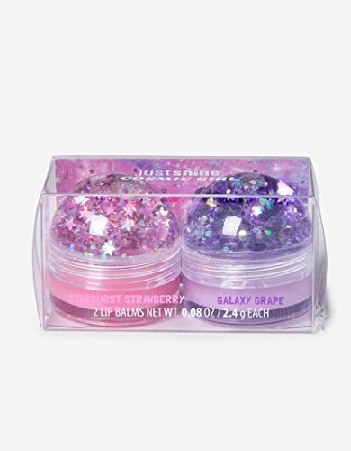 Out of this world style Two lip glosses with shimmering glitter pots Starburst Strawberry and Galaxy Grape flavors Polybutene / Mineral oil / Ethylhexyl / Balmitate / Beeswax / Phenoxyethanol / Methylparaben / Ethylparaben / Propylparaben / Tocopheryl Acetate / Mica / Red 7 Lake / Titanium Dioxide / Fragrance May contain: Red 6 Lake / Bue 1 Lake