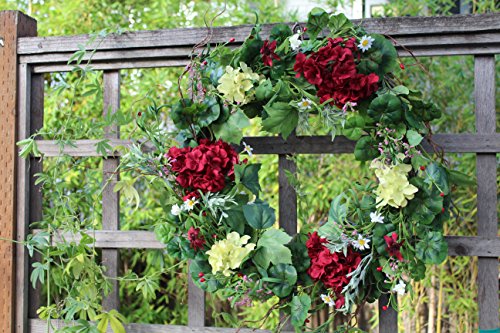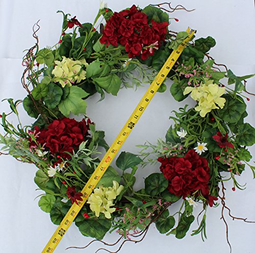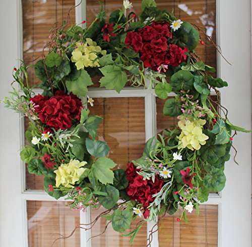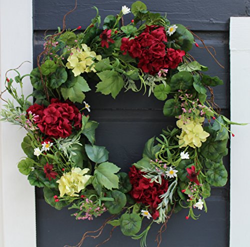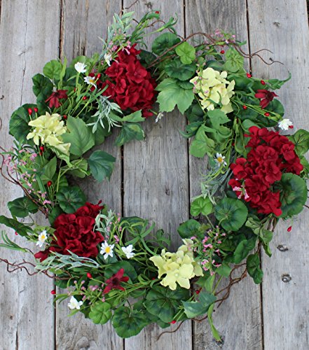 A true four season front door wreath from winter onwards. Handcrafted on a thick, natural sturdy grapevine wreath base with faux geranium heads and faux hydrangeas. Red berries, wispy tiny pink blossoms, and silk greenery abound.
