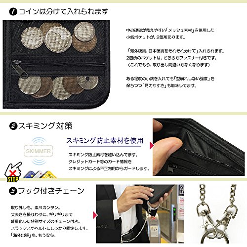 -. Feature : 旅行用財布。スキミング対策仕様(電磁波シールド生地使用) / 硬貨、紙幣、カードを分けて収納できます。盗難防止用のチェーンと首かけ用の専用ロープ付き。更に【小銭は2つのポケットに分けて収納出来る】点が特徴です。 日本の硬貨と海外硬貨を別々に振り分けらため重宝します。 クレジットカードホルダーは、取り出し難い【横位置】で設定。 スキミング意外でも「紛失防止」の対処は万全です。 / 開いていない状態からも【パスポートが出し入れ可能】になっております。 / ※電磁波の周波数帯等、状況により効果が得られないこともあります。空港でのセキュリティ検査(金属探知器)に反応する場合があります。 / ※洗濯不可。(汚れた場合は表面を中性洗剤で軽くお拭きください)