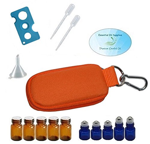 - Includes: 1- Key chain essential oil bag; 2-2ml blue and 3-1ml blue glass roller bottles with stainless steel balls and black caps; 5-2ml amber glass euro orifice reducer bottles; 1-MyOilKey plastic essential oil bottle opener (assorted colors); 1 mini funnel; 2-.5 ml pipettes