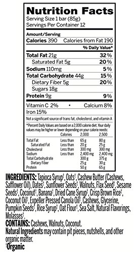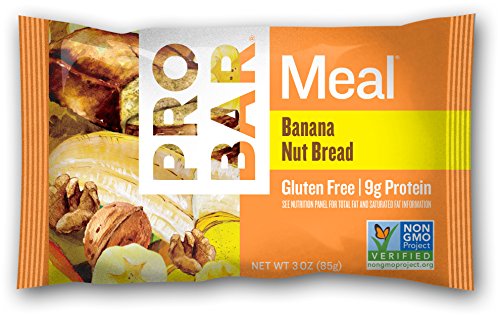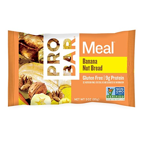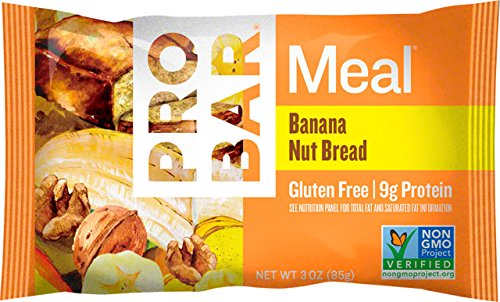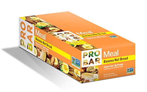Studio : ProBar Publisher : ProBar Binding : Misc. Product Description The Meal bar is filled with fruits, nuts and seeds to make it delicious, satisfying and nutritious. These raw ingredients create the right nutrient-dense calories for lasting energy and nourishment. High in fiber. Delicious meal replacement. High in protein and omega 3 and 6. The Banana Nut Bread Meal Bar offers breakfast flavor with nutrient dense calories. Flavor: Banana Nut Bread. Serving Size: 85g. Serving Per Container: 1. Calories: 390. Total Carbohydrates: 44. Sodium: 110. Trans Fat: 5. Protein: 9. Saturated Fat: 21. Total Fat: 0. Sugars: 18. Cholesterol: 0. Calories From Fat: 190. Dietary Fiber: 5. Special Consideration: Certified Organic. Special Consideration: GMO Free. Dietary Considerations: Dairy Free. Dietary Considerations: Gluten Free. Dietary Considerations: Soy Free. Dietary Considerations: Vegan. 0