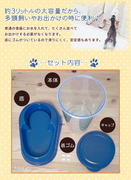 fk094igrjsたっぷり3Lの大容量で、お留守番をさせる時や多頭飼いに便利☆一定の量が下部から出てきます。分解して水洗いができるのでお手入れも簡単です☆ 製造国:イタリア 素材・材質:PET、プラスチック 仕様:容量:3L※お届け地域により、別途運賃がかかる場合やお届けできない場合がございますので、お問い合わせ下さい。