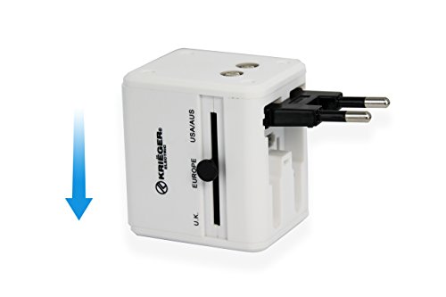 KRIEGER Universal Travel Adapter Plug • Perfect for your international use and travel with built-in 4 plugs(US/UK/AU/EU),compatible with more than 150 countries Good to Know • Worldwide charging over 150+ countries with US/EU/UK/AU adapter plug. • Simultaneous use of the AC power and dual USB charging ports • Built-in safety shutter,fuse and LED indicator to keep you and your device safe • Slide-out plug release button allows you to conveniently change to any other plug when necessary • Ultra compact and lightweight for you to pack For Optimal Use • The AC power port does not convert voltage. Please ensure your device is rated to handle both 100V-125V and 240V-250V standards. • The USB power ports are compatible with 110V to 125V and 240V to 250V standards.Feature