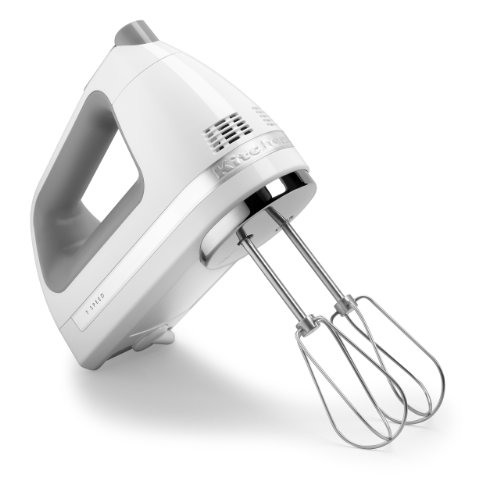 The KitchenAid 7-Speed Digital Hand Mixer has everything you need for effortless mixing and includes two stainless steel Turbo Beater, an 8½ inch (212 cm) long liquid blender and an attractive accessory bag. The powerful DC motor provides years of quiet, reliable operation. Automatic power sensing maintains accurate speed even with the heaviest mixtures.Feature