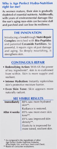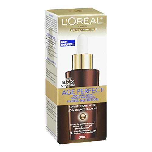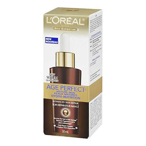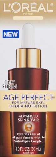 -. Binding : Health and Beauty -. Brand : L'Oreal Paris -. Color : AGE PERFECT HYDRA NUTRITION SERUM -. EAN : 0071249221167 -. Feature : Hydrates and re-cushions skin from within for more toned, resilient, younger-looking skin / Nutri-repair complex enriched with bio-peptides and patented ceramide fortifiers help reverse the signs of past damage and aging / Recommended for daily use / Net Wt. 1.0 oz. -. Label : L'Oreal Paris Skin Care -. LegalDisclaimer : Actual product packaging and materials may contain more and/or different information than that shown on our Web site. We recommend that you do not solely rely on the information presented and that you always read labels, warnings, and directions before using or consuming a product. Content on this site is for reference purposes and is not intended to substitute for advice given by a physician, pharmacist, or other licensed health-care professional. You should not use this information as self-diagnosis or for treating a health problem or disease. Contact your health-care provider immediately if you suspect that you have a medical problem. Information and statements regarding dietary supplements have not been evaluated by the Food and Drug Administration and are not intended to diagnose, treat, cure, or prevent any disease or health condition. ABC Wholesale assumes no liability for inaccuracies or misstatements about products. -. Manufacturer : L'Oreal Paris Skin Care -. Model : K114-19 -. MPN : 10056378 -. NumberOfItems : 1 -. PackageQuantity : 1 -. PartNumber : 10056378 -. ProductGroup : Beauty -. ProductTypeName : BEAUTY -. PublicationDate : 2011-11-23 -. Publisher : L'Oreal Paris Skin Care -. ReleaseDate : 2011-12-15 -. Size : 1 OZ -. Studio : L'Oreal Paris Skin Care -. Title : L'Oreal Paris Age Perfect Hydra-Nutrition Advanced Skin Repair Daily Serum, 1.0 Fluid Ounce -. UPC : 071249221167