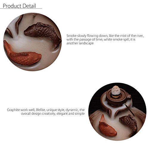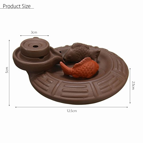Studio : Jeteven Publisher : Jeteven Binding : Kitchen Product Description Description: Incense in the burning, will form a lot of small particles, gathered together, the quality of their own heavier than the air, which will sink down. And pour incense burner for the special tower incense, at the bottom of a small hole, if the smoke than the air sink will be with the tower of the hole down the flow, and then along the backflow censer circuit flow. This is a beautiful landscape. Features: 1. Exquisite workmanship, can be a classical furnishings, with meditation and aid-sleeping effect 2.You can not only appreciate it as an elegant hobby, but also as a special treat for guests. 3. Small and delicate, won't occupy much space, convenient to carry and clean Useage: 1.Use in home: At home , lit a incense , warm and comfortable , and feel comfortable and warm 2.Use in the office Lit a incense , clean air , refreshing , maintain a pleasant body and mind , improve work efficiency 3.Reception Guests Guests visit first 30 minutes before the point of a good smell of incense , is not only a courtesy, respect for the guests , but also reflects the owner elegant taste 4.Easy leissure Lit a incense , while reading a book, while tea, can completely relax , improve quality of life 5.Aerobic exercise When gentle movement exercises such as yoga , meditation and so on , lit a fragrant , the effect will be better received Specifications: Materials: Purple clay Color:As picture showed Suit for: incense cones, incense sticks Characteristic: Smoke backflow Packing Included: 1x 2 Fish Turn-around stories ceramic smoke backflow censer Note: 1. Please allow 1-3 cm error due to manual measurement. 2. As different computers display colors differently, the color of the actual item may vary slightly from the above images, thanks for your understanding. 0