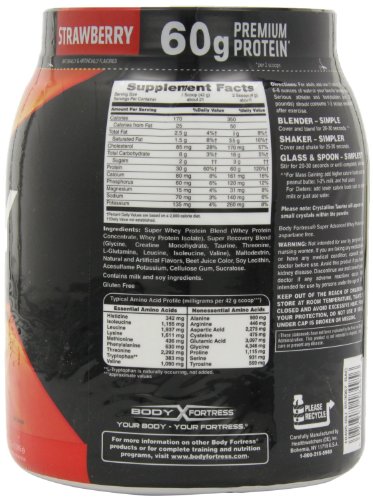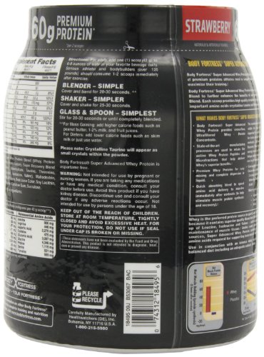 -. Binding : Health and Beauty -. Brand : Body Fortress -. IsAdultProduct : 0 -. Label : Body Fortress -. Manufacturer : Body Fortress -. ProductGroup : Health and Beauty -. ProductTypeName : HEALTH_PERSONAL_CARE -. Publisher : Body Fortress -. Studio : Body Fortress -. Title : Body Fortress Super Advanced Whey Protein, 1.95 lb. (885 g)