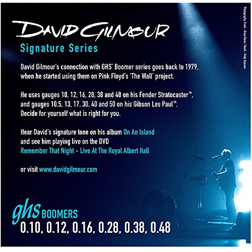 Studio : GHS Publisher : GHS Product Description David Gilmour's connection with GHS' Boomer series electric guitar strings goes back to 1979, when he started using them on Pink Floyd's "The Wall" project. He uses gauges 10, 12, 16, 28, 38, and 48 on his Fender Stratocaster. 0