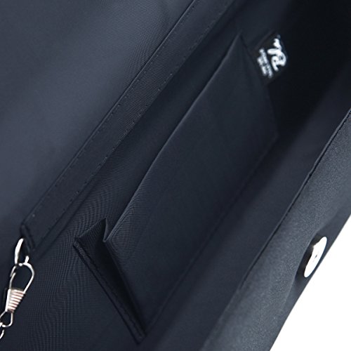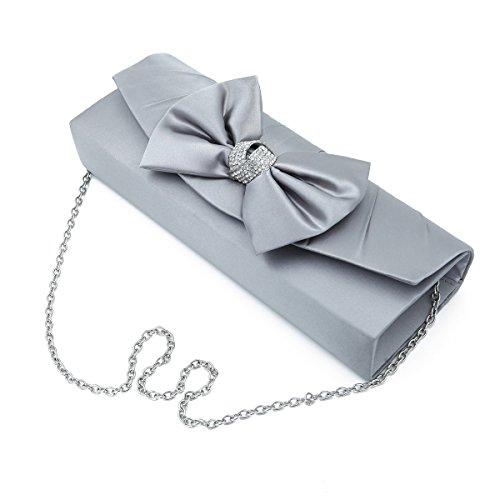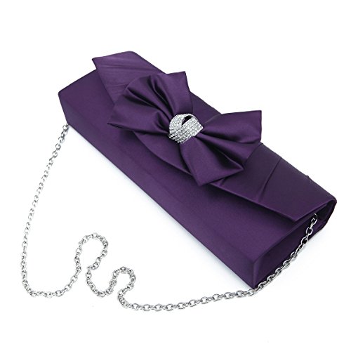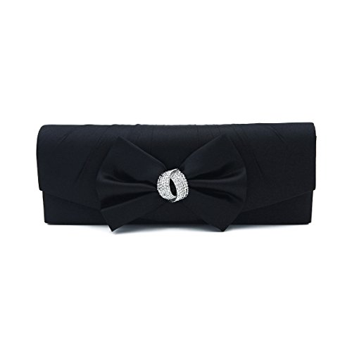 This premium quality evening clutch is both elegant and stylish. Satin fabric with pretty bow and sparkling crystal rhinestones. Fully lined with magnetic-flap closure and inner wall pocket. Removable hideaway shoulder chain strap with 21" drop. Stunning, functional and versatile. The size is 10.5" (L) x 3.5" (H) x 2" (W). Elegant design and luxury feel. A must have accessory for the perfect night out.Feature
