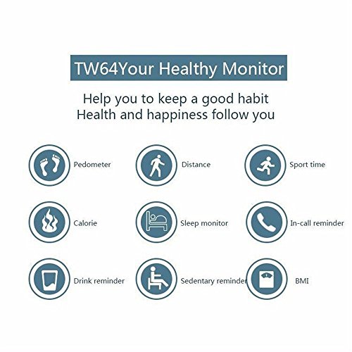 -. Feature : NOTE :the wrist is the one must be used with Mobile phone and dedicated APP. / Love life walking from now on: TW64 have powerful Bluetooth chip and 3D acceleration sensor / Function description: Step counts, Distance measuring, Calorie Consumption management, Sleep management, Event trigger (water drinking, taking medicine, meeting etc), call reminder, message reminder, clock, sedentary reminder, anti- lost (positive and negative direction lookup), remote camera, vibration alarm clock. / Compatible with: Android 4.3 or above, IOS 6.1 or above (such as iPhone 4S, iPhone 5, 5C, 5S, 6, 6+) / 100% New, Tested Before Shipping, Quality Guaranteed.