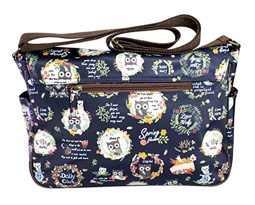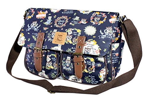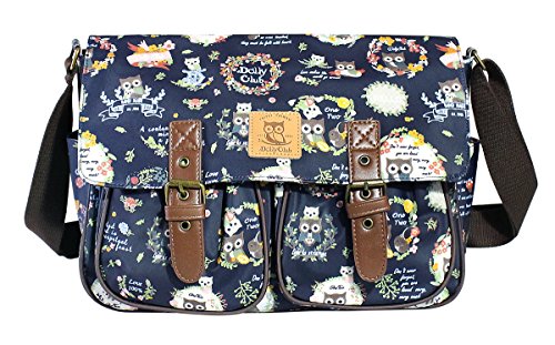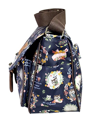 This large functional satchel is designed in a dark navy background with owl and floral motives throughout.