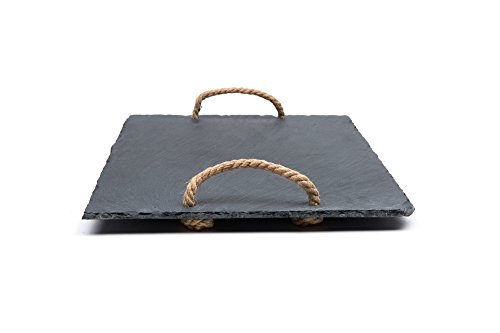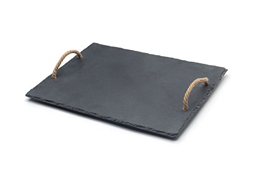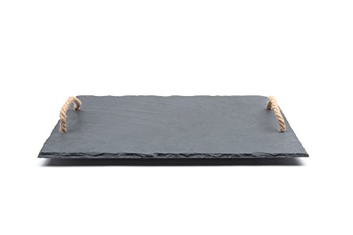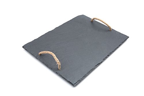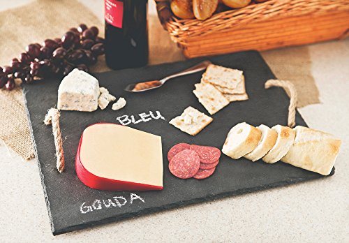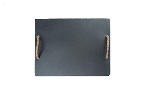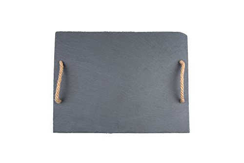 Serve a delicious cheese platter on this modern natural cut slate board. Constructed of slate, this board features convenient rope handles for easy carrying. Soapstone chalk can be used to label cheeses and foods right on the board! Slate retains cold and heat so this board is ideal for serving appetizers, meats, vegetables, cheeses, sushi and desserts. Be sure to bring this unique look to your gatherings with this multi-use natural slate board.Feature