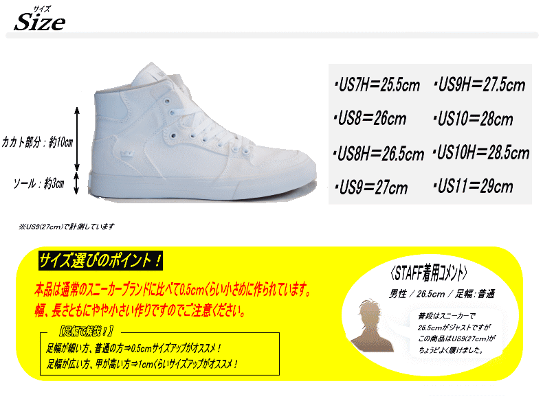 | 商品説明 | <BRAND STORY> 2006年、アメリカのカリフォルニアで誕生したスニーカーブランド。その斬新なデザイン、高い機能からリアルスケーターはもちろんのこと、数々のラッパー、DJ、アーティスト、NBAプレイヤーなど、セレブ達がこぞって愛用している事でも有名である。 <ITEM INFO> ・ブランド創設以来、長年リリースされ続けているのSUPRAの大定番。シンプルかつクラシックなデザインが人気のモデル。※こちらはキャンバス素材になります。 ▼ SUPRA製品について ▼- 必ずお読み下さい - SUPRA製品は、ブランドの特製上、ファッション性を強く意識しているが為、物によって作りが荒い物もあります。ブランド志向が強く、細部のクオリティーまでこだわる方には、あまりオススメ出来ません。縫製が荒い物、接着剤のはみ出し、アッパーの多少の汚れ、靴ヒモへの色移り、スウェードの擦れ、インソールの浮きやズレ、品質にムラがある場合が御座います。これらは、SUPRAブランドの製品の特性上の事ですので、予め、ご了承の上、お買い求め下さい。 |