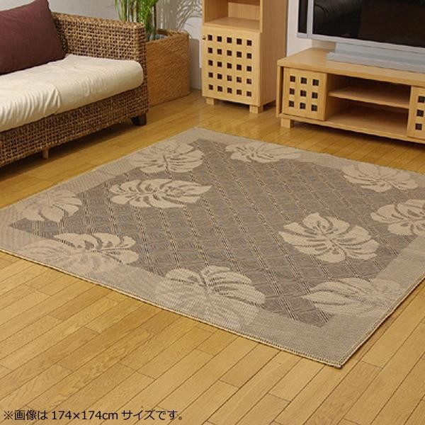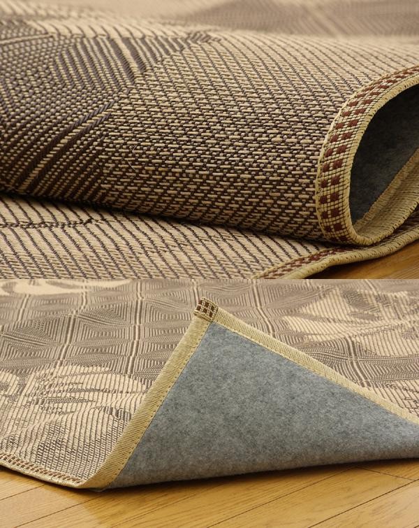 麻の一種であるジュート糸と、ポリエチレン糸のジャガード織のカーペットです。裏面にはフローリングを傷つけにくいよう不織布を貼っています。 |