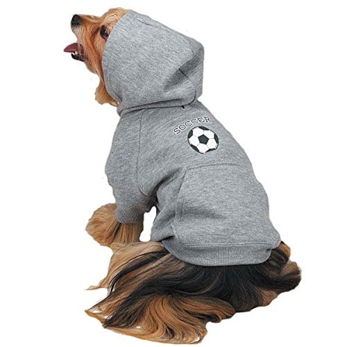 -. Feature : X-SMALL - For dogs measuring up to 8 inches from base of neck to base of tail. / Fashionable heather gray color with screen print "Soccer" and ball emblem. / Convenient hole for attaching leash to collar and pocket on the back. / Elastic ribbed waistband and cuffs for a comfortable fit. / Easy care. Machine washable in cold water, tumble dry low. Made of 65% polyester and 35% cotton.