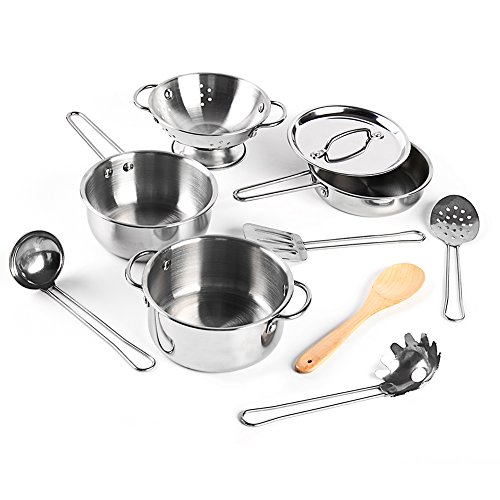 -. Feature : PERFECT SIZE: larger size for greater fun; the utensils are measured 7.3" long while others are 5.1" in diameter;a great gift for both boys and girls; / SUPERB DETAILED: all handles are looped with riveted construction, which would be much more tight and smooth than welding construction; / SUPERIOR MATERIAL: made of high quality, hand-polished shiny stainless steel and real wood; no sharp edges, safe for children to play with; / MORE ACCESSORIES: 16 total pieces, includes 4 metal utensils and a wooden one, 4 metal pans and pots, come with a lid that fits them all; / "YUMMY" PLAY FOOD -- come with one drumstick, one banana, one strawberry, one egg, one broccoli and a bunch of grapes;