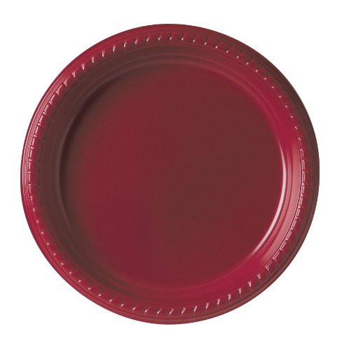 This SOLO PS95R-0099 red, round Party plate is medium-weight disposable dinnerware, 9" in diameter, for use with hot or cold foods. It is made of polystyrene plastic for hardness and resistance to bending. It has decorative divots on the rim for easy plate separation. This disposable plate is 0.8" in height with a deep well for rigidity and reducing spills.