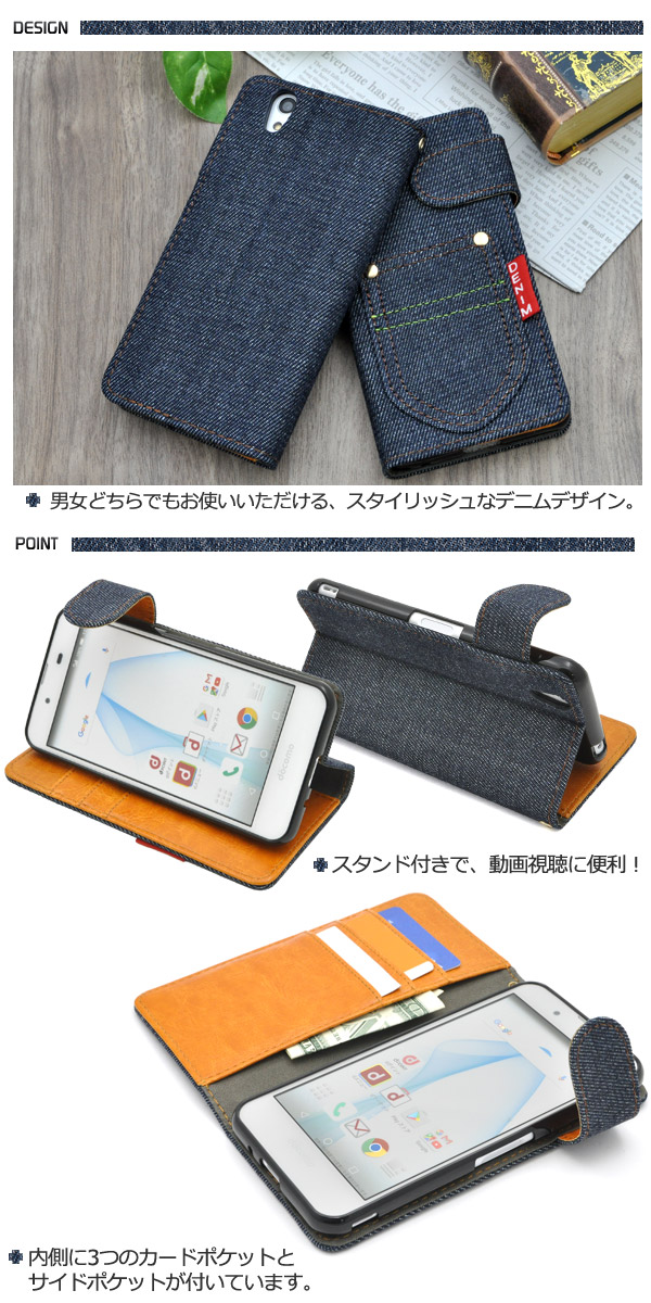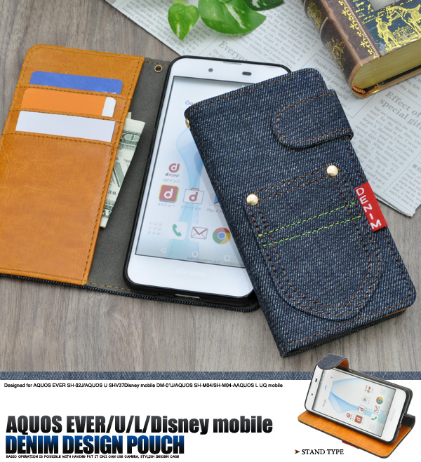 AQUOS EVER SH-02J/AQUOS U SHV37 Disney mobile DM-01J/AQUOS SH-M04/SH-M04-A AQUOS L UQ mobile用デニムデザインスタンドケースポーチ | | | |