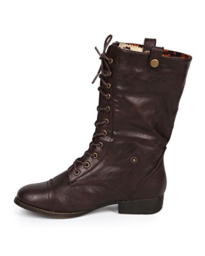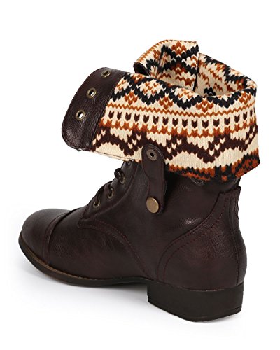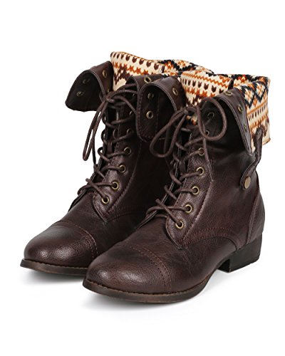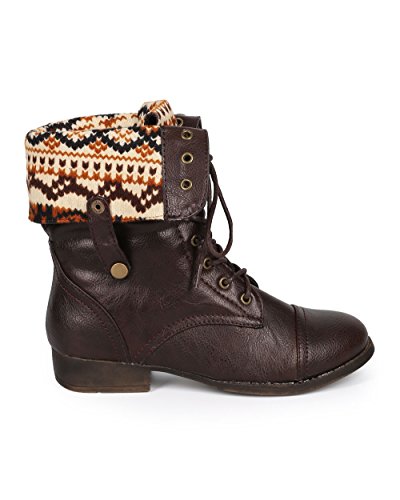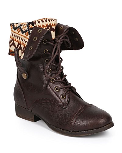 DbDk CI81 Women Distressed Leatherette Tribal Fold-Over Combat Boot - Brown