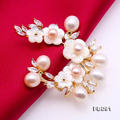 -. Feature : Lovely multicolor pearl brooch with shiny zircons, white shell flowers and natural multicolor freshwater pearls. / The 8.5x10mm oval pearls have very smooth flawless skin and strong lustre. / Brooches are often worn on a jacket or blouse with the purpose of dressing up an outfit. By using brooches on a little black dress, the outfit becomes dressy and stylish, even if it is placed at the "V" of the neckline or at the waist. It is also very popular to wear a brooch at the top of a buttoned blouse. / Brooches are added to hair, hats, purses, gloves and scarves to make these accessories more fashionable. / Pearl Customization ia available. Any question or request on our pearls quality, size, setting, metal type, please feel free to contact us, we are always here to help you.