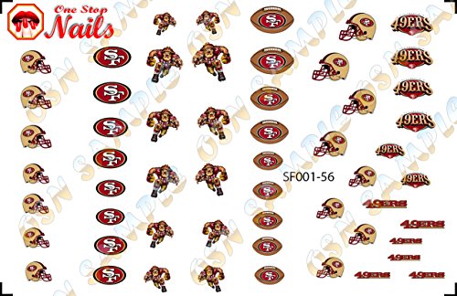 San Francisco 49ers clear waterslide Nail Decals (Tattoos) Very easy to apply Top Salon Quality Can be applied to any types of nails: Acrylic, Any type of Gel, Regular Nail polish Made in USA Brand : One Stop Nails MPN(PartNumber) : SF001-56-A20 Product Dimensions(LxWxH) : 13x8x1cm ; 5 g