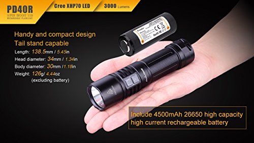 RECHARGEABLE with LONG RUNTIME - Fenix PD40R runs up to 2 hours at 1000 lumens and days on lower modes, powered by an included high capacity 4500mAh 26650 battery. It comes built-in USB charging port and cable so you don't need to worry about buying new battery. It even reminders you to charge when battery level is low.