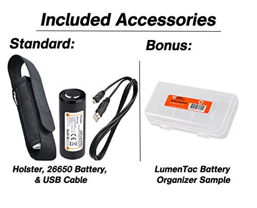 COMPLETE PACKAGE - Includes a long-lasting rechargeable 26650 battery and USB cable for keeping your light powered up and going strong, and lanyard and holster for convenient carrying options, and a sample LumenTac Battery Organizer capable of carrying 2x 18650 or 4x CR123A batteries.