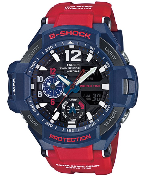 カシオ CASIO ジーショック G-SHOCK スカイコックピット SKYCOCKPIT クオーツ メンズ 腕時計 ウォッチ ネイビー  商品仕様:(約)H50.8×W52.1×D16.6mm(ラグ、リューズは除く)、重さ(約)85g 樹脂(ケース)、樹脂(ベルト) BOX、保証書、取扱説明書メンズクオーツ、20気圧防水、耐衝撃構造(ショックレジスト)、ブラックIP(イオンプレーティング)、 針退避機能(針が液晶表示と重なって見づらいときは、針を液晶表示の上から一時的に退避させることができます)ワールドタイム:世界48都市(31タイムゾーン、サマータイム設定機能付き)+UTC(協定世界時)の時刻表示 方位計測機能:16方位・方位の角度(0 359°)を計測、方位連続計測(60秒)、北方位指針機能、磁気偏角補正機能、方位補正機能 温度計測機能(計測範囲: 10 60℃)ストップウオッチ(1/100秒、60分計、スプリット付き)タイマー(セット単位:1分、最大セット:60分、1秒単位で計測) 時刻アラーム5本・時報フルオートカレンダー12/24時間制表示切替 操作音ON/OFF切替機能LEDバックライト(オートライト、スーパーイルミネーター、残照機能、残照時間切替(1.5秒/3秒)付き)、カラー:ネイビー(文字盤)、レッド(ベルト)1年間