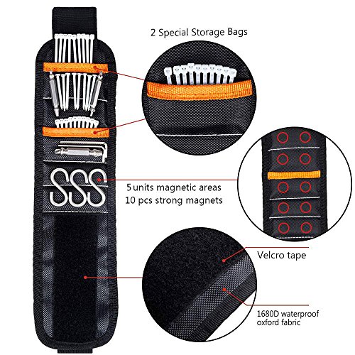 - STRONG WRISTBAND MAGNET with built-in 10 magnets (5 straps) to keep the screws,nails,bolts,nuts and other mental tools in place when you are doing jobs. And there is no way to fall off from the magnetic wristband. A must have for your woodworking, home improvement, and do-it yourself projects.