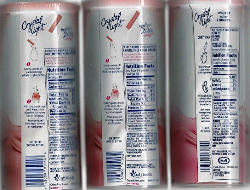 You get 3 cannisters each containing 6 pouches. The flavors are Strawberry Watermelon, Strawberry Kiwi and Strawberry Orange Banana 1 pouch makes 2 quarts. Each flavor is Caffeine Free, Gluten Free and low in Sodium Only 5 Calories per serving Brand : Crystal Light EAN : 0738613594882