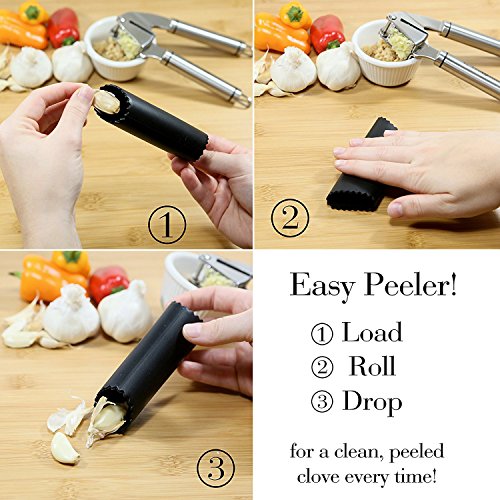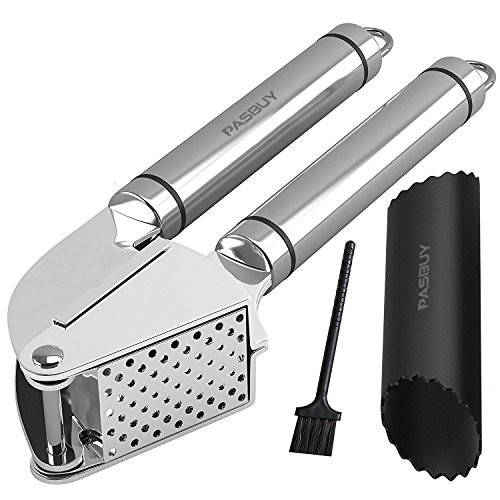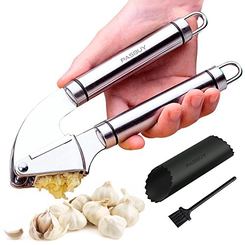 PASBUY P7081G Grillers Garlic Press and Peeler Set. Stainless Steel Mincer Includes Clove Peeler and Cleaning Brush