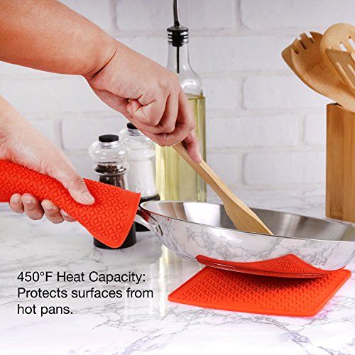 - HEAT-RESISTANT TRIVETS: 450°F maximum heat capacity protects your kitchen countertop and dining surfaces when you serve hot food dishes for you or your family. Safely place hot plates, pots, pans, serving dishes, trays, or any cookware on the mat.