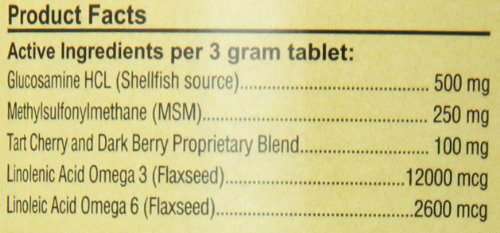 Overby Farm Hip Flex Joint Level 1 Early Care with Tart Cherries. Recommended as a Preventative Maintenance to Help Maintain Normal Healthy Cartilage and Joint Function in Active Dogs. Tart Cherry Concentrate is a Natural Antioxidant and Helps to Avoid Discomfort by Supporting the Body's Normal Inflammatory Response. Tasty, Chewable Tablets, 120ct for Dogs. Recommended to Double the Suggested Daily Amount for the First 3 Weeks. Active Ingredients per 3 Gram Tablet: Glucosamine, Methylsulfonylmethane, Tart Cherry and Dark Berry Proprietary Blend, Linolenic Acid Omega 3 and Linolenic Acid Omega 6. All Overby Farm Products are Veterinarian Formulated and Manufactured in the USA in an FDA Audited, cGMP Compliant Facility with a 100% Satisfaction Guarantee.Feature