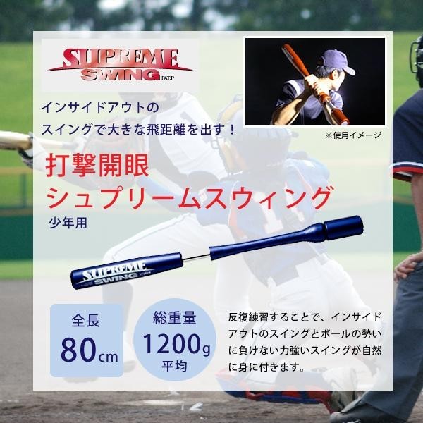 | 「シュプリームスウィング」は、インサイドアウトのスイングを体得するのに最適なトレーニング器具です。インパクトでは快音とともに瞬間的な負荷が最大になり、支点移動に伴う強く鋭い身体の回転でバットは大きな軌道を描きます。反復練習することで、インサイドアウトのスイングとボールの勢いに負けない力強いスイングが自然に身に付きます。 |