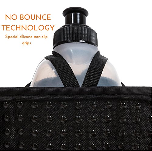 - Water bottles have solid holdings on the belt. They're not jumping around during the run. Stable way of holding by velcro
