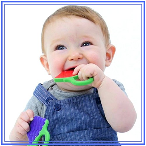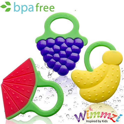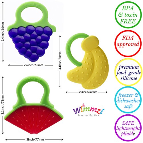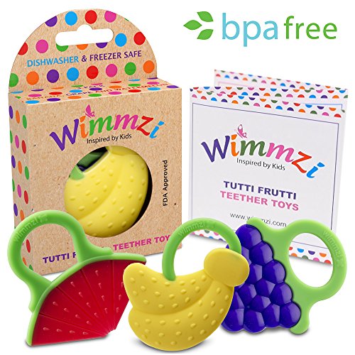 -. Title : Wimmzi "Tutti Frutti Teether Toys"- Best Baby & Toddler Teething Pain Relief -Works Or Your Money Back! -100% Safe, Fun Set of 3 Soft, Chewy Silicone Teethers With Rings - BPA Free, FDA Approved - Fridge & Dishwasher Safe