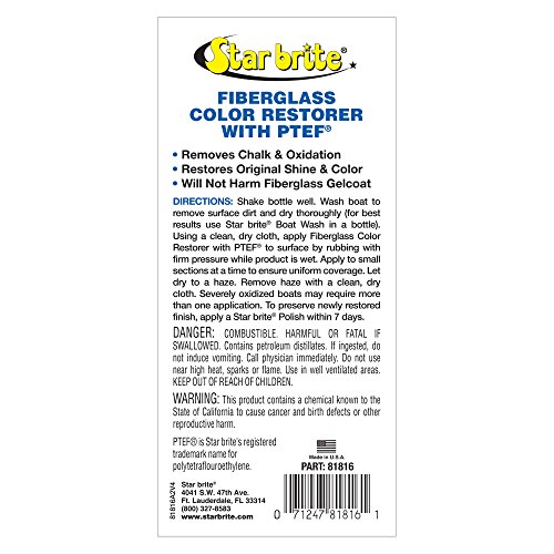 -. Binding : Sports -. Brand : Star Brite -. EAN : 0071247818161 -. Feature : The easiest way to restore original color and luster to faded fiberglass surfaces / Removes heavy oxidation, chalking and fading / Seals restored finish with protective barrier of PTEF polymers to guard against UV rays that cause fading and oxidation / Easy to use; can be applied by hand or with a buffer / This item is not for sale in Catalina Island -. HazardousMaterialType : Unknown -. IsAutographed : 0 -. IsMemorabilia : 0 -. Label : Star brite -. Manufacturer : Star brite -. ManufacturerPartsWarrantyDescription : Parts -. Model : 081816PW -. MPN : 081816PW -. NumberOfItems : 1 -. PackageQuantity : 1 -. PartNumber : 081816PW -. ProductGroup : Sports -. ProductTypeName : SPORTING_GOODS -. Publisher : Star brite -. ReleaseDate : 2009-06-11 -. Size : 16 oz -. Studio : Star brite -. Title : Star brite Fiberglass Color Restorer With PTEF - 16 oz -. UPC : 071247818161