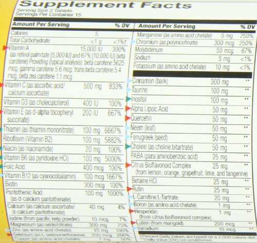 -. Feature : Daily Support Nutrients-Cinnamon, Neem, Chromium & Fenugreek for healthy blood balance. Plus Taurine, L-Carnitine & Vanadium which are often low in diabetics. / Antioxidants-Vitamins A, C & E, plus Selenium, Alpha Lipoic Acid, Lutein & other flavonoids to maintain cell and tissue strength. / MEGA Potency B-vitamins-to protect nerves and maintain nerve sheath.