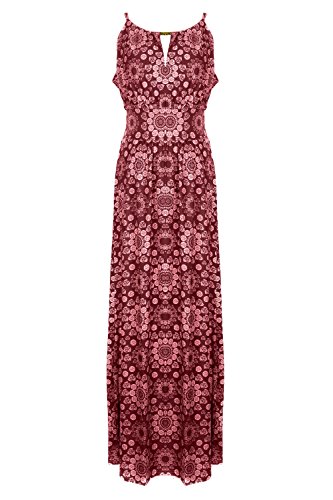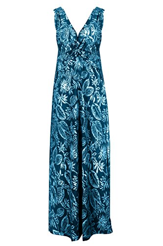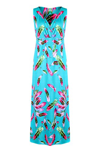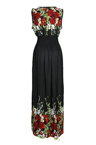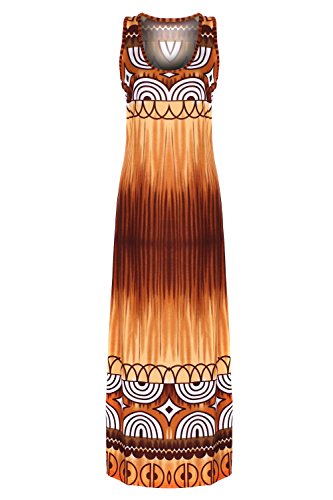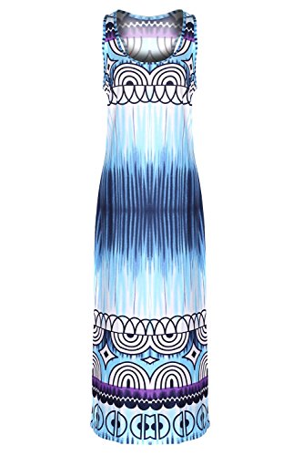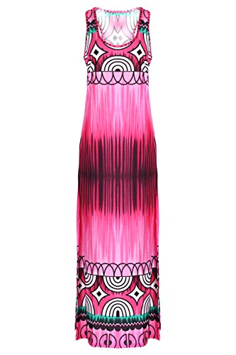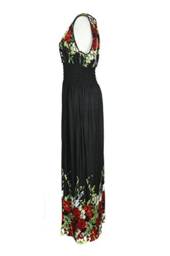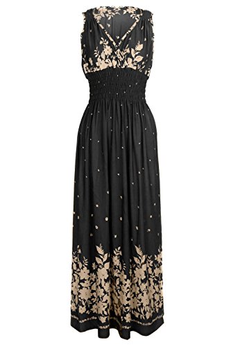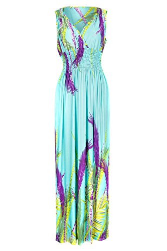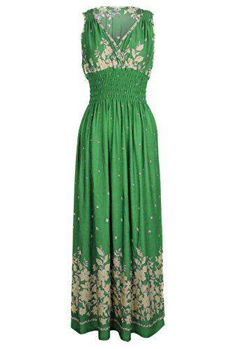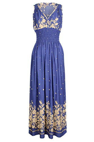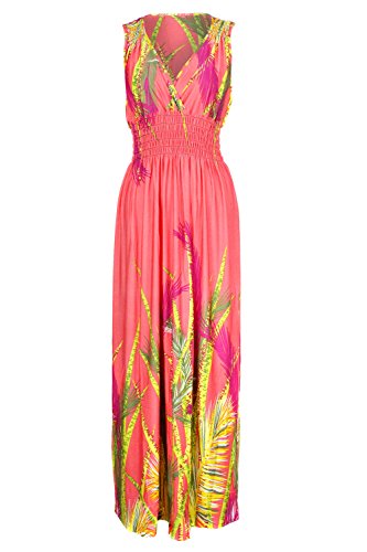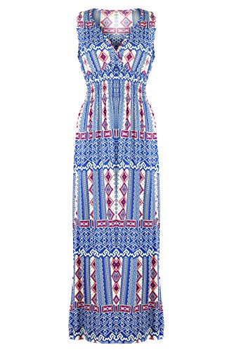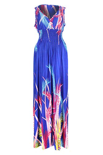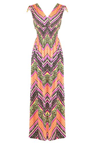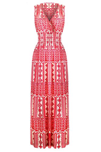 Sleeveless long smocked dress featuring a bohemian inspired bright bold printed pattern all throughout for the spring summer season. Surplice crossover v-neckline and a fitted smocked stretch construction accenuating the waistline. Ruched tie and smocked details at shoulders and a lengthy dress in a top quality medium weight jersey stretch knit for softness and comfort.Feature