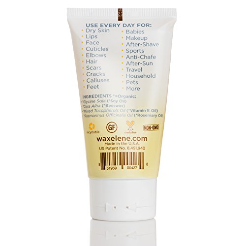 Studio : Waxelene Publisher : Waxelene Binding : Health and Beauty Product Description Moisturize, Protect and Nurture Dry Skin Made with All Organic Ingredients Patented Waterproof Barrier Won't Clog Pores Multi-Purpose, Therapeutic Ointment is Petroleum free and Hypoallergenic Celebrity Recommended Use every day for: - Dry Skin - Lips - Face - Cuticles - Elbows - Hair - Scars - Cracks - Calluses - Feet - Babies - Makeup - After-Shave - Sports - Anti-Chafe - Travel - Household - Pets - More INGREDIENTS *=Organic: ? *Glycine Soja (*Soy Oil) ? *Cera Alba (*Beeswax) ? *Mixed Tocopherols Oil (*Vitamin E Oil) ? *Rosmarinus Officinalis Oil (*Rosemary Oil) 0