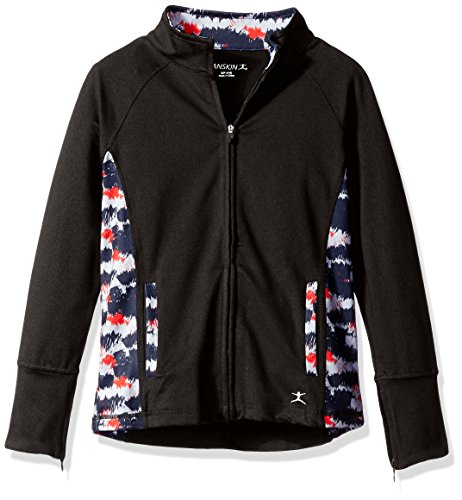 Danskin girl's USA gymnastics zip-up jacket in a moisture wicking fabric blend with a soft brushed finish. Features zip front, zippered cuffs, mock neck styling, princess seaming, contrast shockwave print front to back side inserts, convenient front pockets, printed inner collar and cuffs, plus cover stitched details.Feature