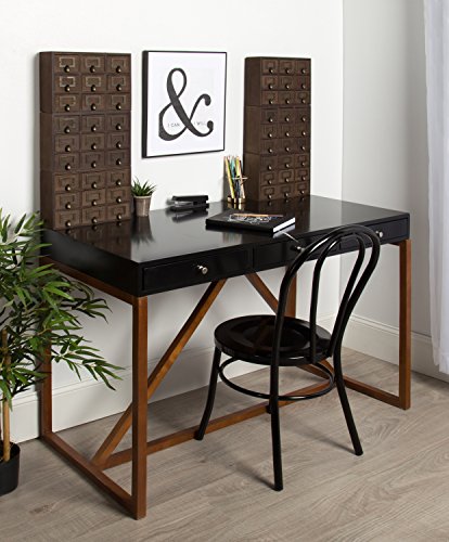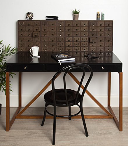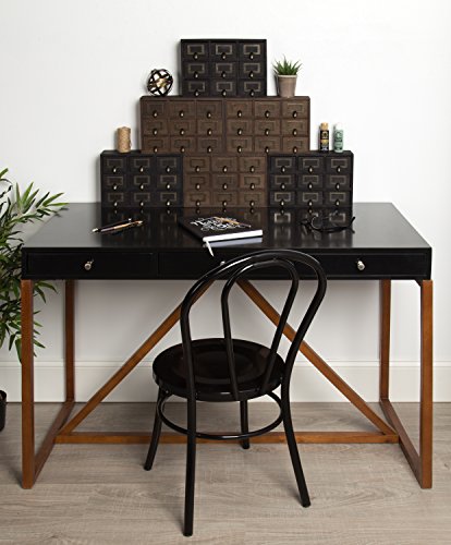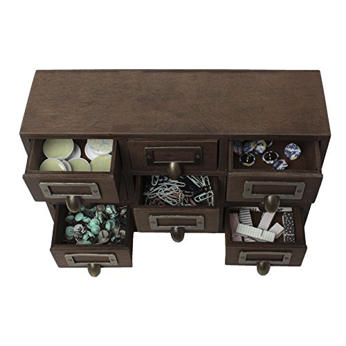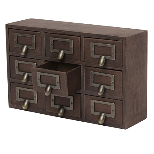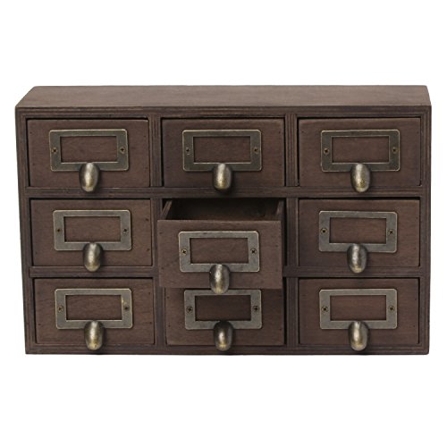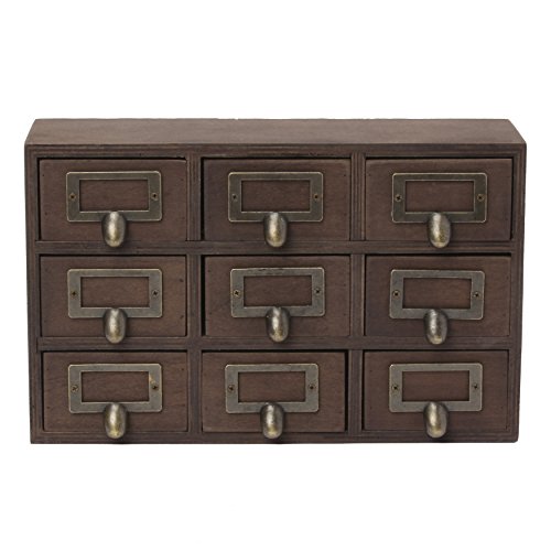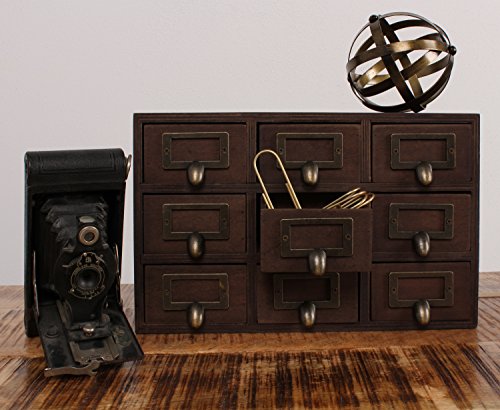 Hide away your odds and ends in this charming small desktop set of apothecary drawers. Each piece includes 9 drawers, each with a metal label holder. This rustic chic set of drawers is perfect to hold paper clips, pushpins, or other desk accessories. Each drawer has an inner area of 3.25 inches by 3 inches by 2 inches. The overall size of the drawer set is 12 inches wide by 7.5 inches high and 3.5 inches deep-perfect for your home office desktop!Feature